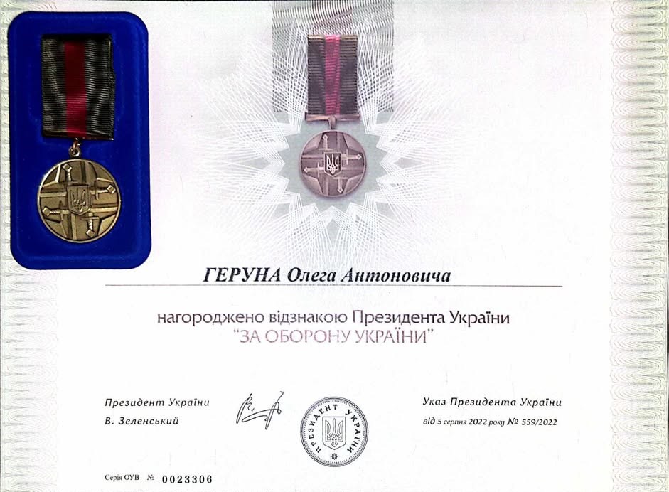 Олег Герун понад два роки боронить Україну у лавах десантно-штурмових вiйськ. На момент нагородження вiн обiймав посаду стрiльця-гранатометника третього вiддiлення другого взводу десантно-штурмової роти вiйськової частини А2777. За цей час йому довелося пройти крiзь найзапеклiшi бої на Донецькому та Херсонському напрямках.
