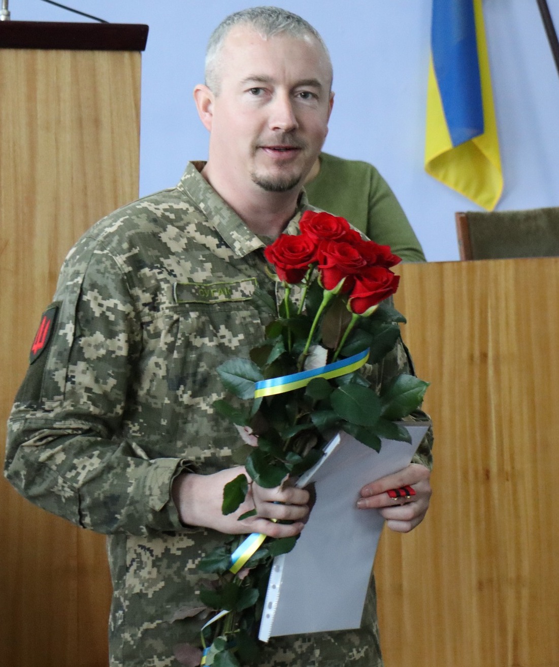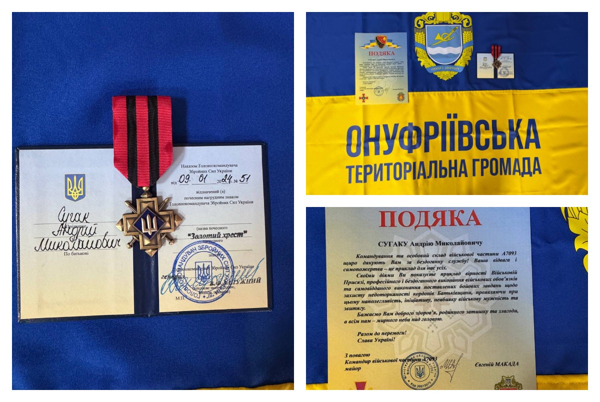 Захиснику з Онуфріївської громади – Андрію Сугаку вручили почесний нагрудний знак Головнокомандувача Збройних Сил України «Золотий Хрест» за проявлену мужність і успішне виконання завдань під час бою.