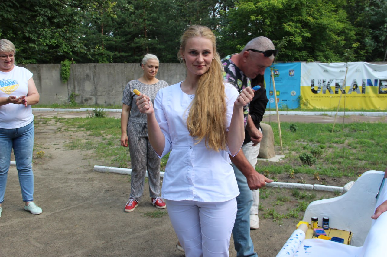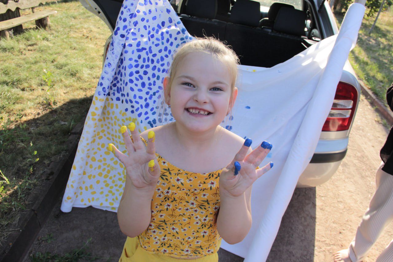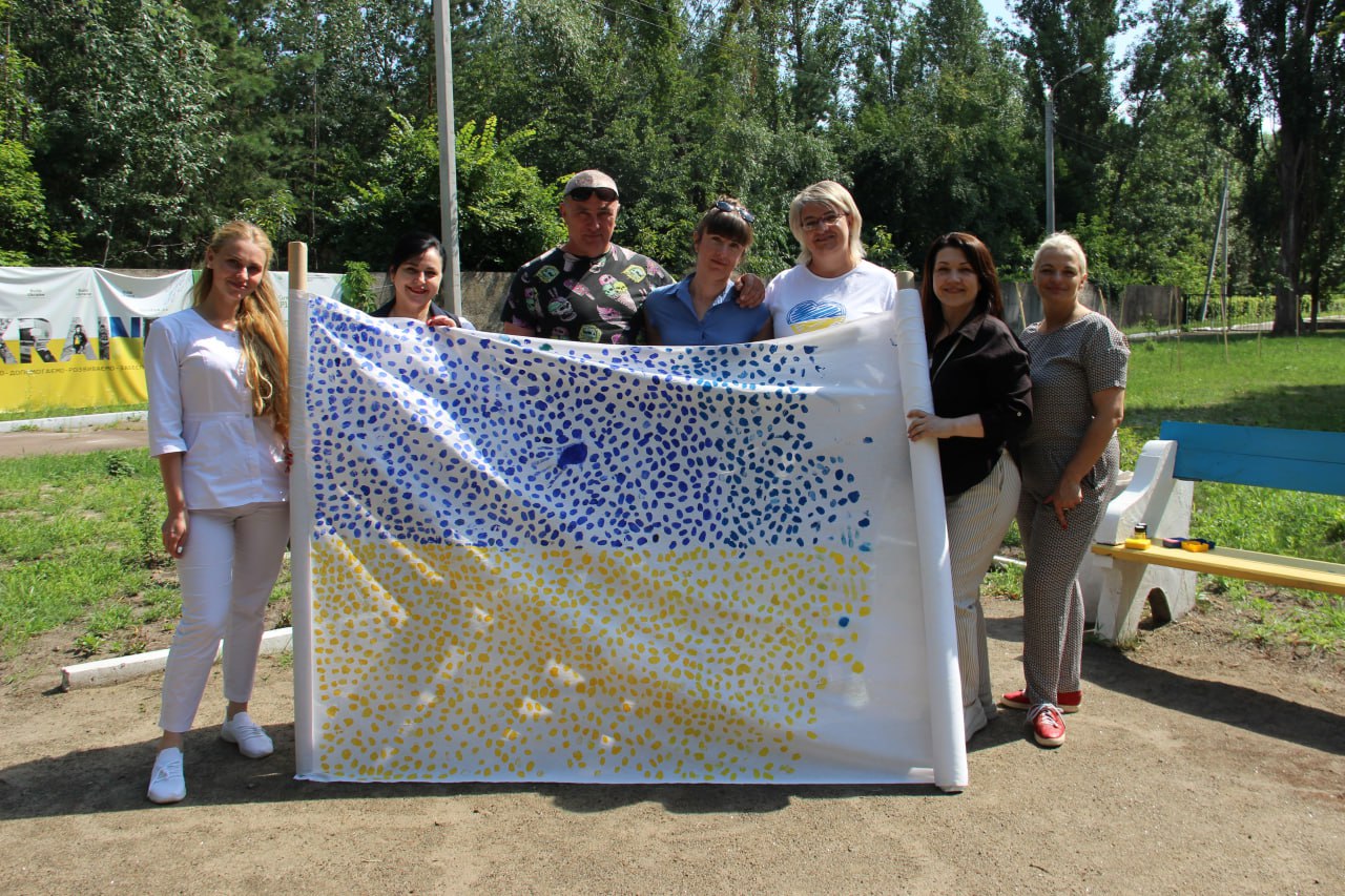 Хто бажає залишити свій відбиток на прапорі патріотів, може прийти до молодiжного центру “Кома”, що знаходиться в центрi дитячо-юнацької творчостi і зробити це за будь-які донати на ЗСУ.