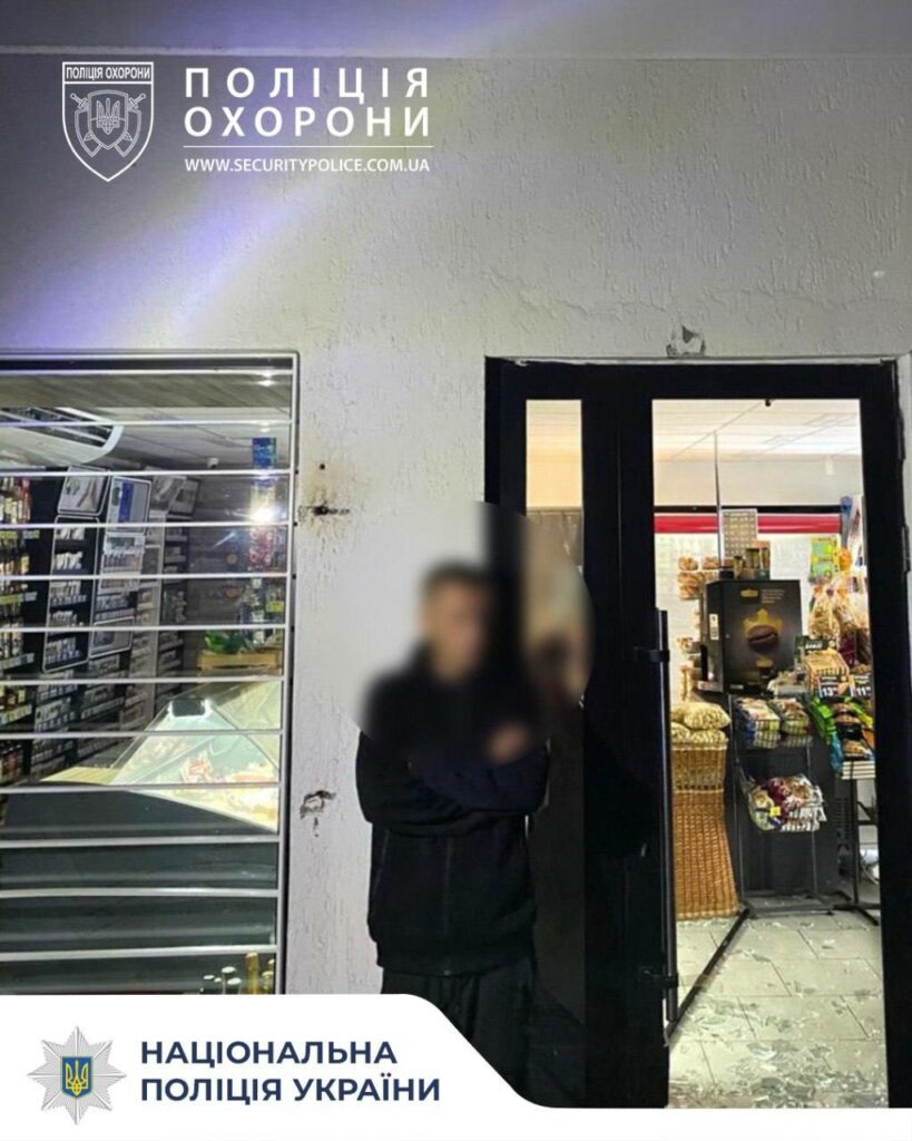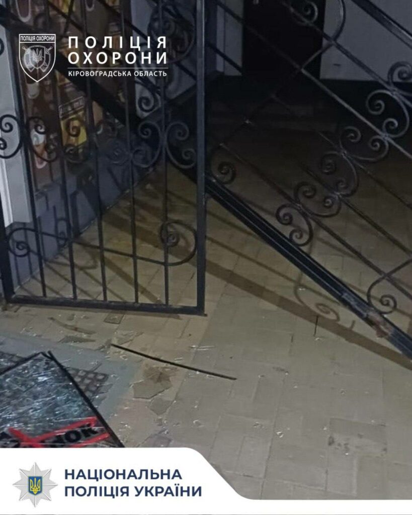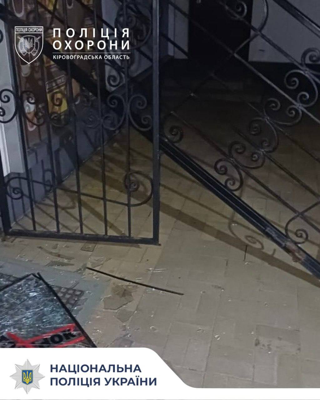 На виклик негайно прибув наряд реагування батальйону полiцiї охорони. На мiсцi подiї було виявлено жителя Олександрiйського району 1992 року народження, який розбив склянi дверi та пошкодив металевi ґрати магазину.