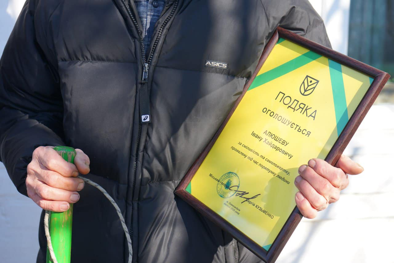 Вiд iменi мiського голови Сергiя Кузьменка вона вручила рятiвнику подяку та висловила вдячнiсть за порятунок життя.