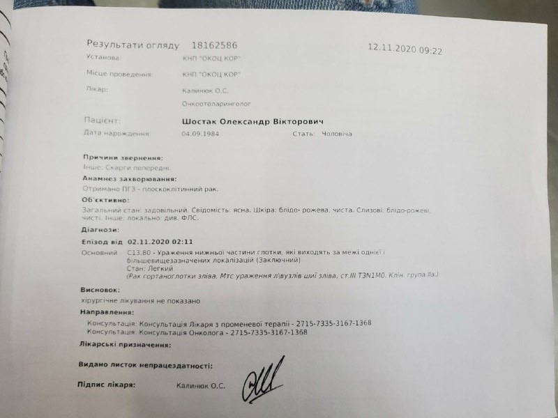 “Але біль і нездужання все посилювалися, після чого лікар відправив на обстеження в онко, де виявили пухлину горла. Були взяті проби з пухлини на аналіз, в результаті була виявлена злоякісна пухлина”, – розповідає дружина Надія Шостак