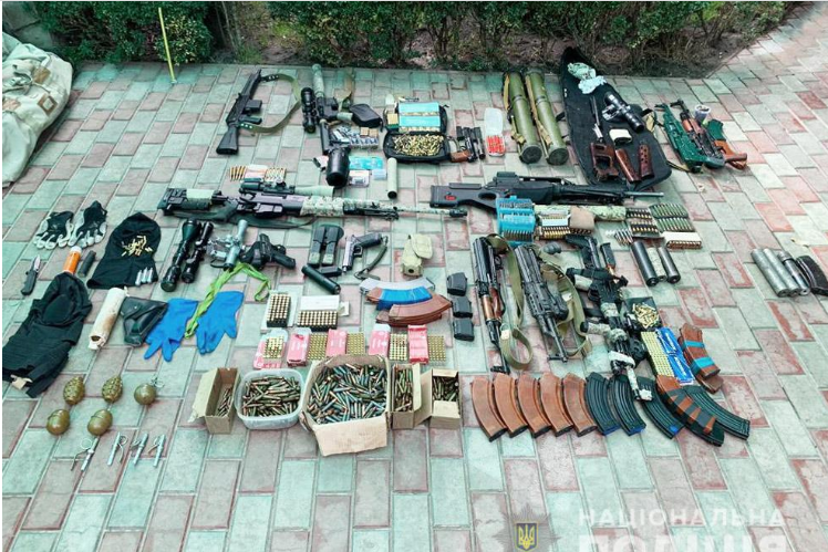 2 ручних протитанкових гранатомети, 3 гвинтiвки з оптичним прицiлом, 2 карабiни, 4 автомати, 3 пiстолети, 5 ручних гранат та запали до них, близько 5 тисяч набоїв рiзних калiбрiв, димовi шашки, пiдривачi, саморобнi вибуховi пристрої, глушники до зброї, оптичнi пристрої, магазини до рiзних видiв зброї, тактичне спорядження, балаклави, комплектуючi до зброї.
