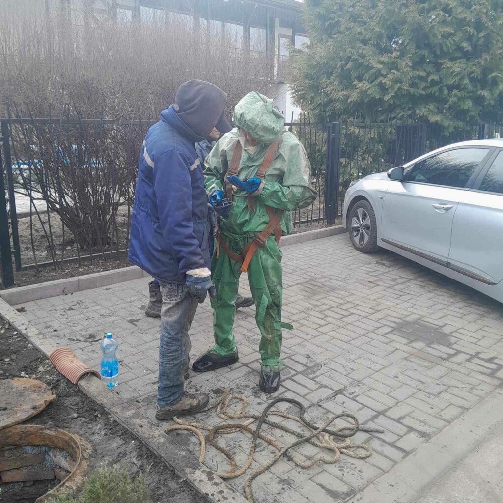 Водоканальники в спецiальних костюмах та протигазах, з дотриманням усiх вимог технiки безпеки, спустилися в колектор i от вже тиждень дiстають з рiзних дiлянок труби твердi вiдходи, якi протягом зими змивали в унiтази жителi району.