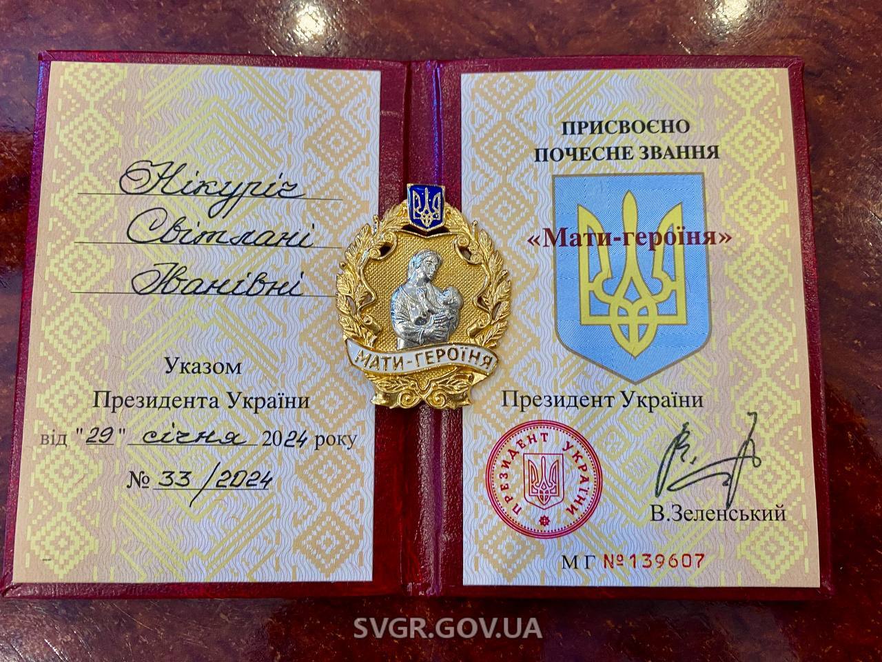 Посвідчення «Мати — героїня» вручили Світлані Нікуріч жительці с.Миронівка, яка народила та виховала п’ятьох дітей: троє доньок та двох синів.