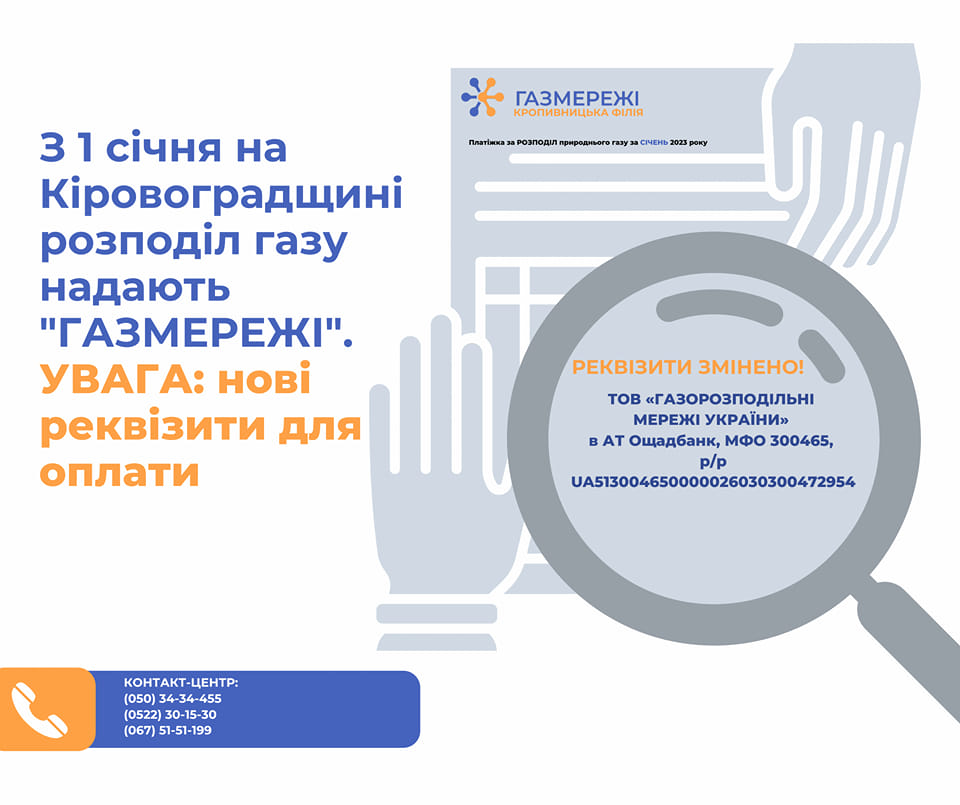 Стали вiдомi новi реквiзити на оплату послуг за розподiл природного газу на Кiровоградщинi в 2023 роцi.