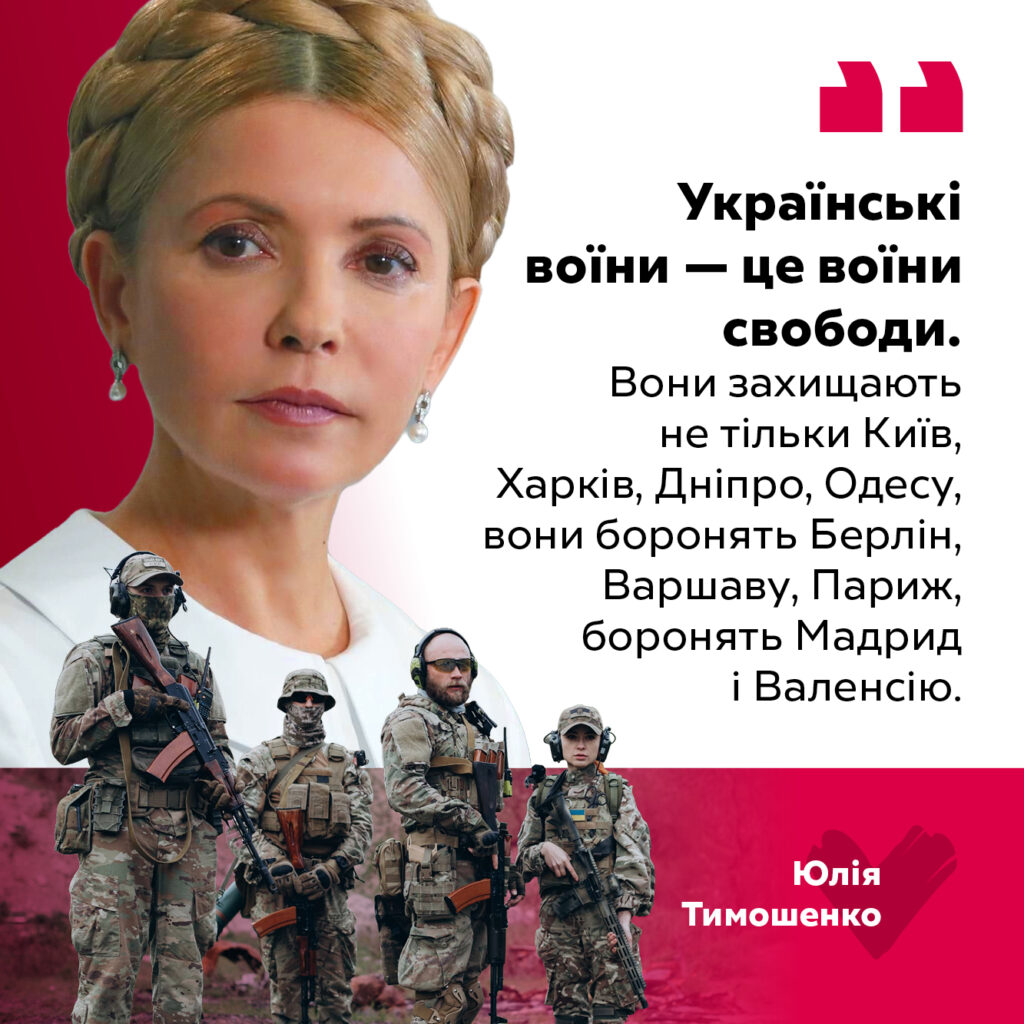 «Українські воїни – це воїни свободи. Вони захищають не тільки Київ, Харків, Одесу, Дніпро, вони боронять Берлін, Варшаву, Париж, боронять Мадрид і Валенсію! Безпека Європи і України є неподільною. Бо безпека Європи починається з безпечних кордонів цілісної України», – Юлія Тимошенко.