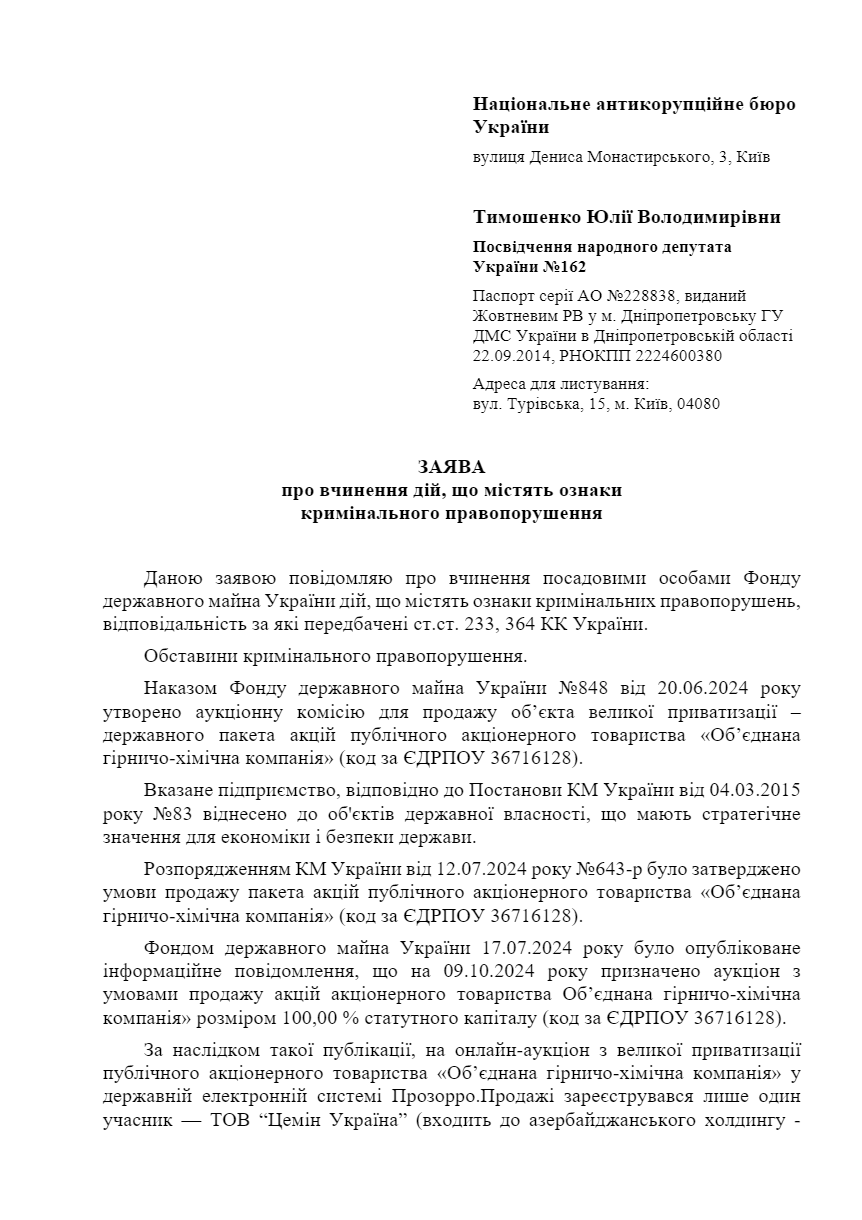 «Посадовими особами Фонду державного майна України, усупереч економічним та безпековим інтересам України, було вчинено дії з приватизації працюючого та ліквідного підприємства, що має стратегічне значення для економіки і безпеки держави, за заниженою ціною, у період військової агресії росії, що призвело, у зв’язку із військовими ризиками до відсутності конкуренції серед інвесторів», – йдеться у заяві лідерки «Батьківщини».